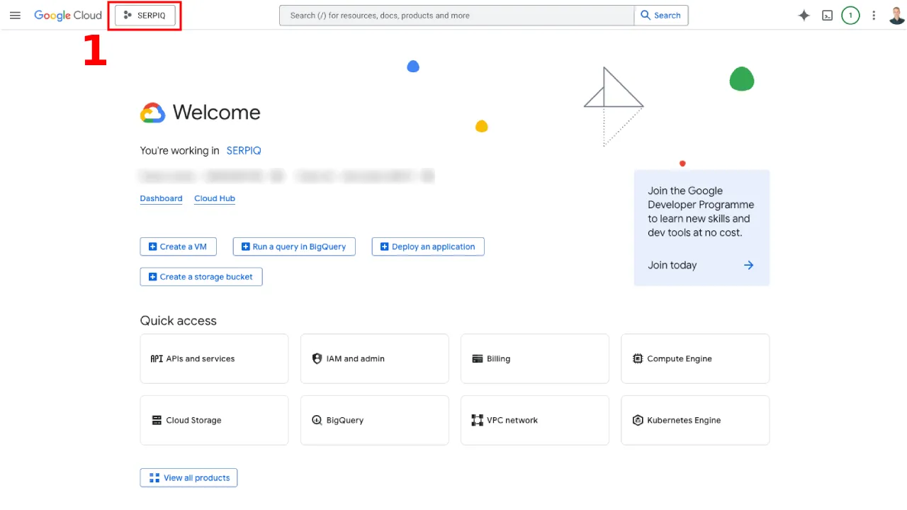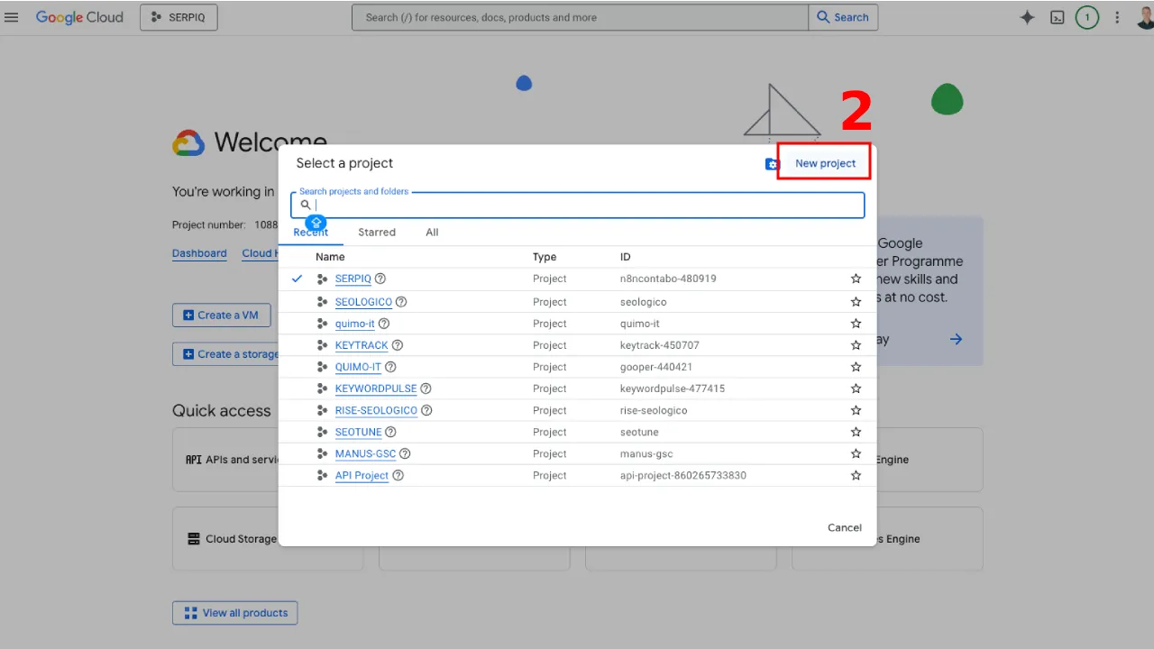 Open Google Cloud Console and select a project (1) or create a new one (2).