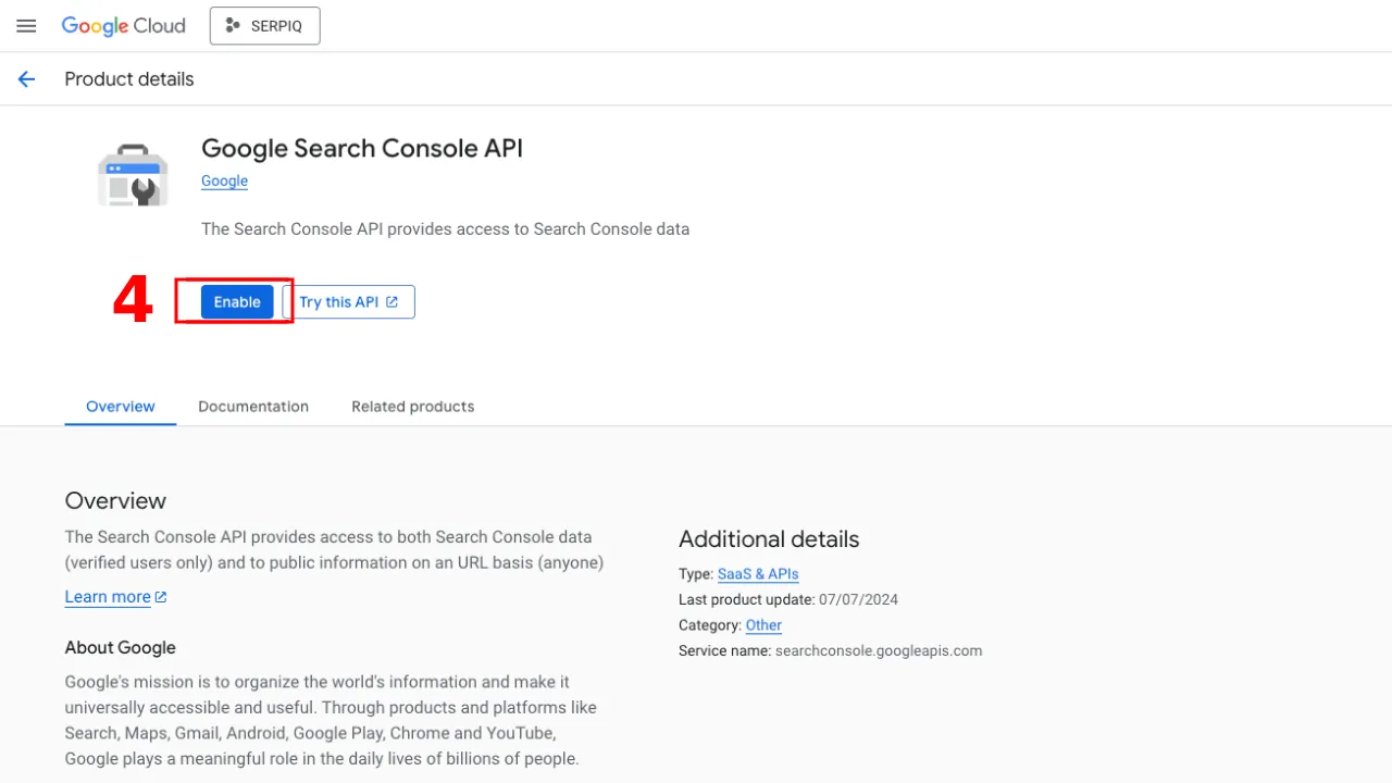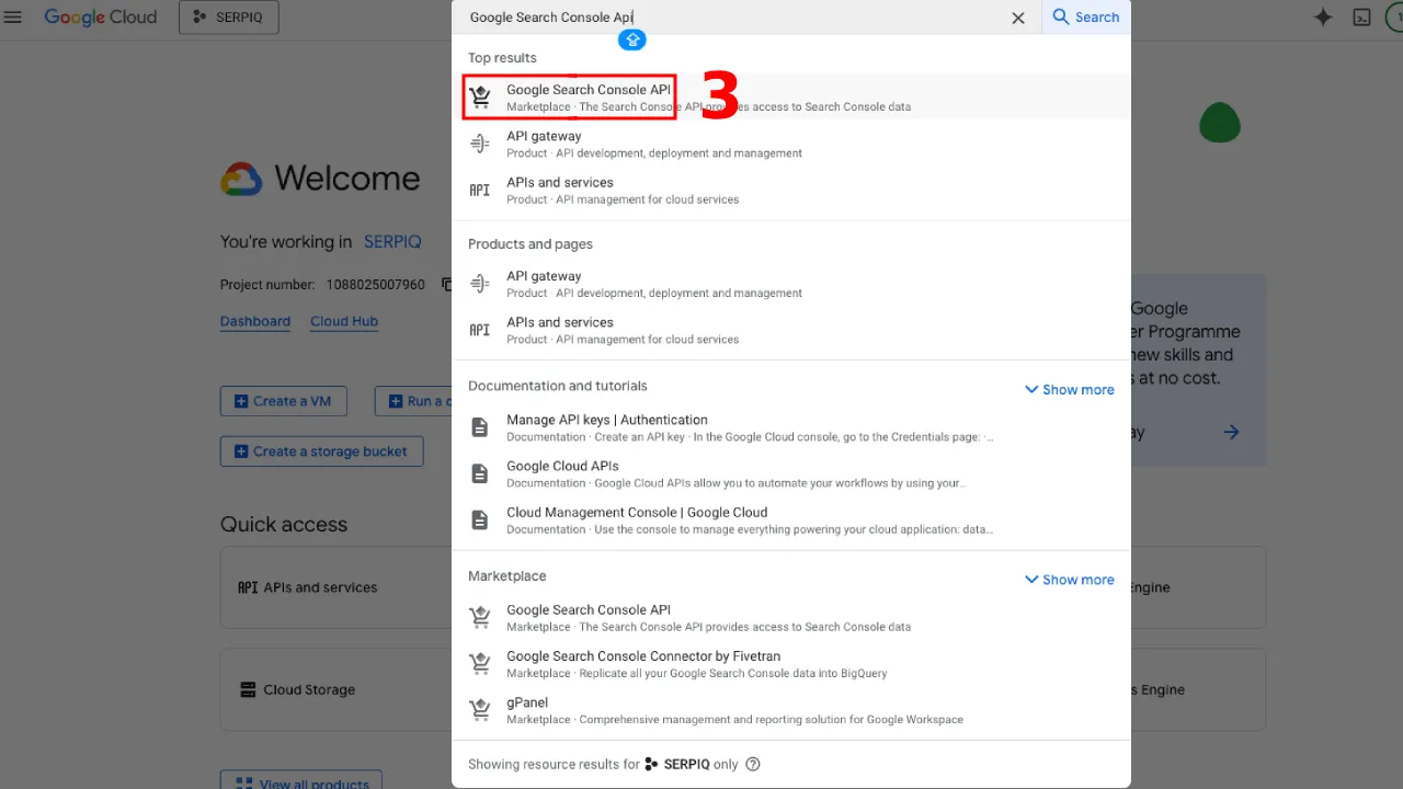 To proceed, type Google Search Console API in the search field (3), then select the Google Search Console API result and click Enable(4).