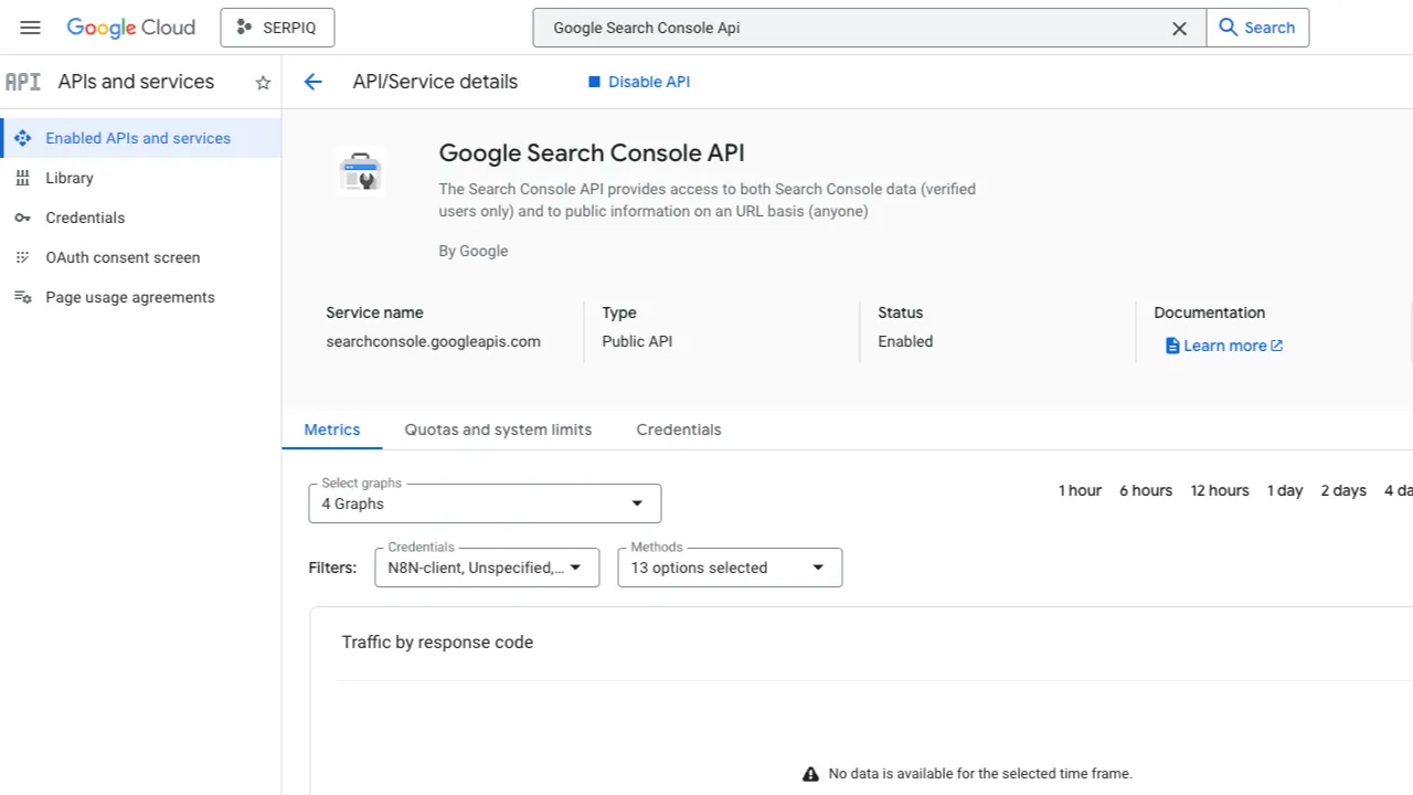 Enable the Google Search Console API for that project (APIs & Services → Library → search “Search Console API” → Enable).