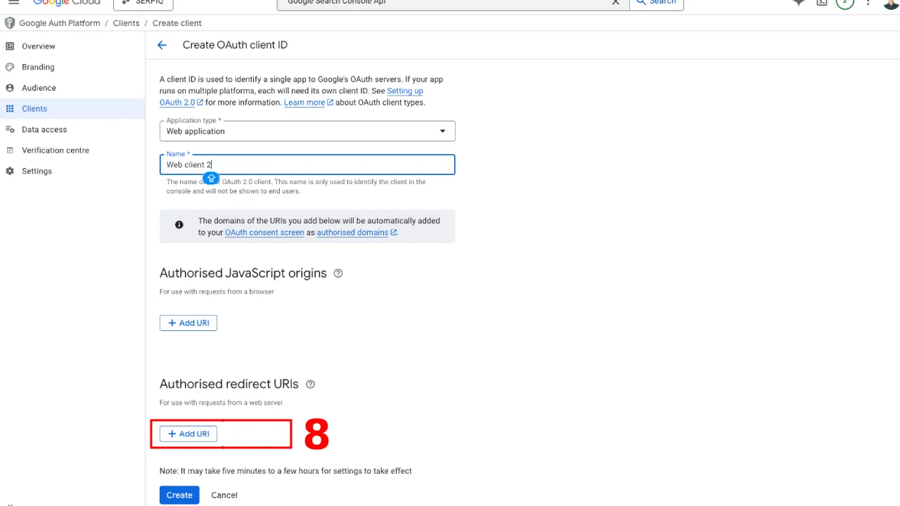 OAuth client settings — enter the URI in the Authorised redirect URIs field (8).