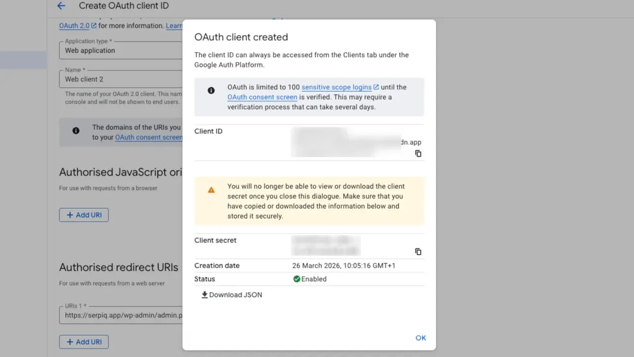 After clicking Create, copy the Client ID and Client Secret (and optionally download the JSON file).