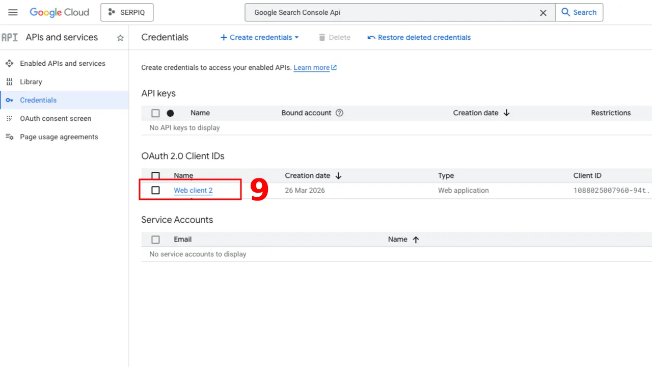 Now proceed with the final step: in the OAuth 2.0 Client IDs section, click the name of the Web application client you just created (9) (in the example shown in the image, Web client 2).