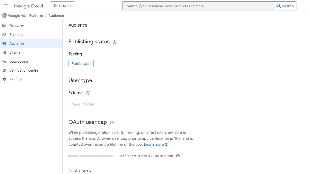 Go to SerpIQ → Settings and follow the Google OAuth steps below before expecting data.