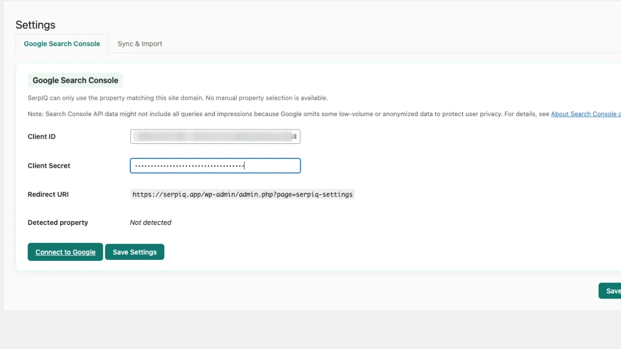 Go to SerpIQ → Settings and paste the Client ID and Client Secret into their respective fields. First click Save Settings, then click Connect to Google.